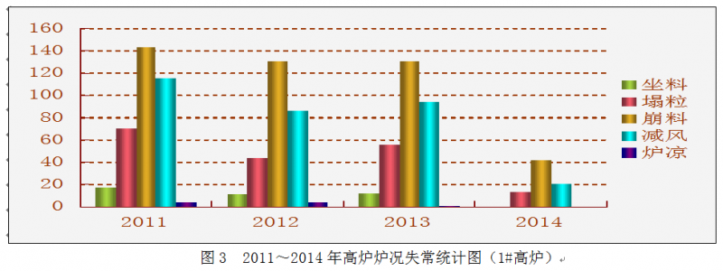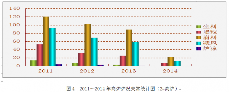 1)爐況順行穩(wěn)定、煤氣利用改善。通過(guò)強(qiáng)化球團(tuán)礦高比例入爐操作方面的探索研究,裝料、送風(fēng)、造渣等各項(xiàng)冶煉制度改進(jìn),高爐操作優(yōu)化,實(shí)現(xiàn)爐況順行穩(wěn)定和煤氣合理利用。高爐崩料、塌料、坐料次數(shù)明顯降低,大的爐況事故基本消除。2011年~2014年1號(hào)、2號(hào)爐況失常情況如圖3、圖4所示。