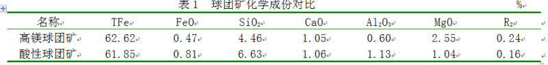 永通鑄管公司3座10 m2豎爐年產(chǎn)酸性氧化球團(tuán)礦140萬(wàn)t,球團(tuán)礦作為高爐酸性爐料,具有品位高、粒度小而均勻、強(qiáng)度高、還原性好等優(yōu)點(diǎn),提高球團(tuán)礦入爐比例后,如高爐能夠保持穩(wěn)定順行,對(duì)高爐燃料比降低非常有利。但球團(tuán)礦存在還原膨脹率高,軟化、熔滴溫度低等高溫冶金性能差等問(wèn)題,特別是球團(tuán)礦的荷重軟化溫度較低對(duì)高爐生產(chǎn)造成不利影響。通過(guò)添加MgO等措施,可以改善球團(tuán)礦的冶金性能[3],為高爐高產(chǎn)、優(yōu)質(zhì)、降耗創(chuàng)造條件。