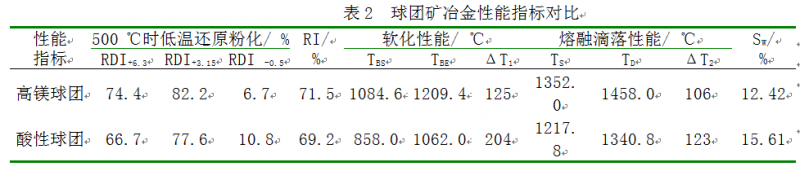 2)高M(jìn)gO球團(tuán)礦冶金性能實(shí)現(xiàn)質(zhì)的提升。豎爐球團(tuán)礦中MgO含量提高到2.5%以上,MgO/SiO2 大于0.3,高M(jìn)gO酸性球團(tuán)同普通酸性球團(tuán)礦相比軟化、熔融溫度提高,軟融區(qū)間變窄,高溫還原度提高,抑制球團(tuán)礦在高爐內(nèi)的異常膨脹和還原粉化和改善高爐料柱透氣性。球團(tuán)礦高溫性能大大改善,爐渣中MgO含量提高,渣鐵流動(dòng)性改善,爐況穩(wěn)定順行。高M(jìn)gO球團(tuán)礦與普通酸性球團(tuán)礦冶金性能指標(biāo)對(duì)比見(jiàn)表2。