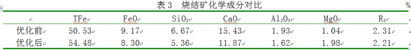 2)燒結(jié)礦冶金性能改善。燒結(jié)礦MgO含量由1.0%提高并穩(wěn)定在2.0%左右,MgO抑制Fe3O4在冷卻過(guò)程中再氧化成Fe2O3,大大降低燒結(jié)礦的低溫還原粉化率(12.08%);改善了燒結(jié)礦的高溫冶金性能,具有品位高(54%),還原性好(84.5%),F(xiàn)eO低(8.5%),熔融帶厚度薄(只有15.5 mm)等特點(diǎn)[5],提高了冶煉時(shí)爐內(nèi)的透氣性和爐渣的流動(dòng)性、穩(wěn)定性,高爐實(shí)現(xiàn)了低硅冶煉和增產(chǎn)節(jié)能。優(yōu)化前、后燒結(jié)礦化學(xué)成分對(duì)比如下見(jiàn)表3。