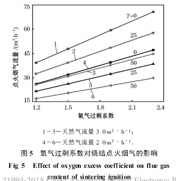 -1 ;如果把γ提高到50 %, 天然氣流量為2m3 ·h-1 , 氧氣過剩系數(shù)為1.9 , 煙氣中的氧氣的體積分數(shù)提高到14.28 %, 煙氣排放量只有25.14m3 ·h -1 。
