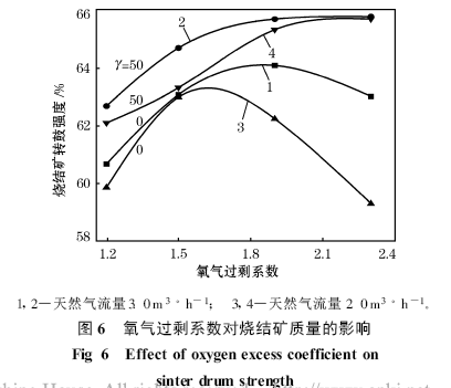 -1 , 空氣作為助燃風, α為1.9 時, 燒結(jié)礦轉(zhuǎn)鼓強度為64.07 %, 利用系數(shù)為1.37 t ·m -2 ·h -1 ;當γ值提高到50 %, 天然氣流量降低到2m3 ·h -1 , α為1.9 時, 可以獲得65.30 %的轉(zhuǎn)鼓強度和1.44 t ·m-2 ·h-1的利用系數(shù)。