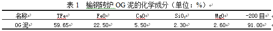 煉鋼OG泥(以下簡稱OG泥)是氧氣頂吹轉(zhuǎn)爐OG濕法除塵的副產(chǎn)品,是一種寶貴的二次資源。OG泥特性:具有含鐵量高,堿性氧化物含量高(二元堿度達(dá)2.35),粒度細(xì)(-0.074mm比例達(dá)90%以上),含水量高,脫水困難,粘性大等特性,OG泥漿濃度在20%以下時,靜置3小時無明顯沉淀。榆鋼煉鋼OG泥化學(xué)成分列于表1。