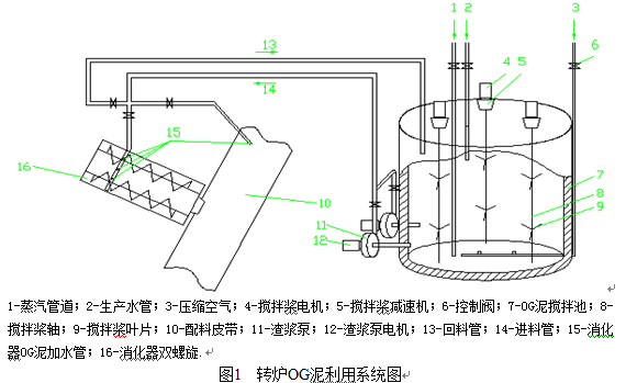 由于OG泥易沉積、粘度大,因此該系統(tǒng)采取雙線雙泵布置,互有備用,滿足連續(xù)生產(chǎn)的要求,同時有利于系統(tǒng)維護(hù)。為防止長時間停止使用OG泥時,污泥沉淀淤積,系統(tǒng)設(shè)計了補(bǔ)水水管和底部設(shè)有壓縮空氣管道,用來調(diào)節(jié)OG泥濃度及燒結(jié)長時間停機(jī)時可以吹掃管道,為了冬季生產(chǎn)提高料溫需要,OG泥攪拌池中還設(shè)計了蒸汽管道,對OG泥泥漿進(jìn)行保溫和加熱。