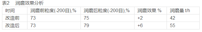 混合物料通過潤(rùn)磨機(jī)處理后,混合物料粒度變細(xì),物料顆粒形狀改變,導(dǎo)致物料活性增強(qiáng),能夠大大提高物料的造球性能,提高生球的產(chǎn)量和質(zhì)量。原采用兩臺(tái)Φ3.2m×5.4m潤(rùn)磨機(jī),礦粉用膠帶機(jī)給到潤(rùn)磨機(jī)給料螺旋機(jī),給入潤(rùn)磨機(jī)的混合物料,用核子稱進(jìn)行自動(dòng)控制。經(jīng)過一段時(shí)間的生產(chǎn),始終存在潤(rùn)磨量與潤(rùn)磨效果的問題,主要是螺旋損壞及篦板破損嚴(yán)重。2004年9月在對(duì)潤(rùn)磨機(jī)定修的同時(shí)對(duì)篦板材質(zhì)進(jìn)行重新選型,采用抗磨、抗沖擊含鎳鑄鐵,鋼球從原來的Φ80mm改為Φ100mm。針對(duì)螺旋損壞嚴(yán)重情況改為行走小車式,大大降低設(shè)備故障率,提高了潤(rùn)磨機(jī)作業(yè)時(shí)間,潤(rùn)磨量也得到了提高。改造前后對(duì)比情況列于表2。