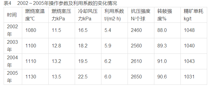 為適應(yīng)生產(chǎn)發(fā)展的需要,對(duì)操作制度進(jìn)行了調(diào)整和完善,主要體現(xiàn)在對(duì)燃燒室操作參數(shù)的調(diào)整上,調(diào)整情況列于表4。根據(jù)原料的焙燒性能調(diào)整燃燒室溫度,主要是為了充分保證生球在爐內(nèi)進(jìn)行氧化反應(yīng)所需的熱能。提高冷卻風(fēng)壓力,主要是確保爐內(nèi)有充分的氧化氣氛以加快反應(yīng)速度,還可增加熱交換速度,將爐身下部生球的物理熱傳遞到爐身上部提高烘干速度。由于這些調(diào)整,在利用系數(shù)提高的情況下,球團(tuán)礦質(zhì)量有所改善。