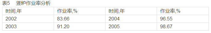 采用全員操檢結(jié)合的操作制度。崗位工人既是操作工又是檢修工,充分發(fā)揮崗位工人熟悉現(xiàn)場(chǎng)設(shè)備的特點(diǎn),通過合理的分配制度調(diào)動(dòng)崗位工參與檢修的積極性。同時(shí)在操檢結(jié)合的基礎(chǔ)上,單獨(dú)設(shè)置點(diǎn)檢人員,以加強(qiáng)對(duì)關(guān)鍵設(shè)備的監(jiān)護(hù),實(shí)現(xiàn)工程師、點(diǎn)檢員、崗位工的三級(jí)點(diǎn)檢制度,豎爐的作業(yè)率得到較大提高,見表5。
