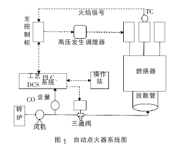 當(dāng)轉(zhuǎn)爐開始冶煉,冶煉信號發(fā)送到煤氣點火裝置的自動化系統(tǒng),系統(tǒng)發(fā)出點火指令,需要放散的點火煤氣管道的電動球閥被打開,點火裝置開始點火,伴燒火源“ 長明燈”天然氣開始燃燒,由火焰檢測裝置檢測是否點著, 并將檢測信號反饋給PLC系統(tǒng)。放散的轉(zhuǎn)爐煤氣被“ 長明燈”點燃。