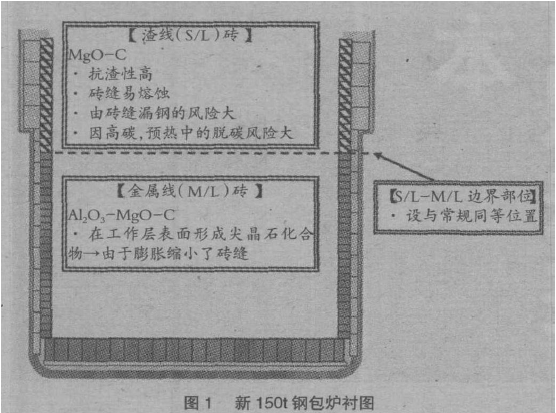 圖1 是開爐時150t 鋼包的爐襯。首先,鋼水滯留時與渣接觸的渣線(S/L)的耐火磚材質使用了含抗渣侵潤性的MgO-C(MC)磚。在與鋼水接觸的金屬線(M/L)的耐火磚材質,除考慮耐熔蝕性以外,還擔心磚縫開裂導致的磚縫漏鋼,使用了在工作層表面形成由MgO 和Al2O3↙↙,組成的尖晶。石化合物,體積膨脹可縮小磚縫的Al2O3↙↙-MgO-C(AMC)磚。其他部位耐火磚材質。使用了與大同特殊鋼公司知多廠原80t 鋼包相同的材質。此外,對S/L 和M/L 的邊界部位,考慮到LF鋼水攪拌的影響,將S/L 降低到與常規(guī)同等的位置。