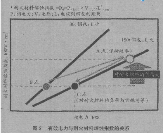 關于LF 鋼包爐襯的熔蝕,除鋼水、渣與爐襯接觸導致的熔蝕外,還要考慮到電極的電弧導致的熔蝕。這次擴大爐容,加上鋼包大型化和鋼包容量的增加,事先對LF 投入電力進行了研究。圖2 是有效電力與耐火材料熔蝕指數(shù)的關系。耐火材料熔蝕指數(shù)是根據(jù)從LF 投入電力和電力源到耐火材料的距離計算出的電極電弧對耐火材料負荷的指標。為了使爐容擴大后的LF 的通電時間與擴大前的通電時間相等,所以需要增加投入電力(圖2 中的A 點)。但是,如果增加到A 點的投入電力,耐火材料熔蝕指數(shù)比爐容擴大前(圖2 中的B 點)增加。因此,這次不增加到A 點的投入電力,設定了與爐容擴大前同等的耐火材料熔蝕指數(shù)的投入電力(圖2 中C 點)。