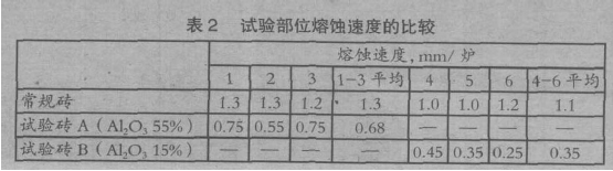 改善S/L 磚襯的同時,變更了M/L 磚AlO3-MgO-C 的材質。為了降低M/L,磚與渣反應導致的熔蝕,選。擇了提高磚中的MgO 成分、降低Al2O3,成分的Al2O3-MgO-C 磚。此外,為了找到最佳的MgO 成分值,試驗材質’準備了MgO 成分不同的兩種磚。試驗方法采用將一部分邊界部位的M/L 磚替換為試驗材質的試驗,與常規(guī)磚的熔蝕速度進行了比較,表2 是試驗結果。MgO 成分是常規(guī)磚2 倍的試樣A,邊界的熔蝕速度降低到常規(guī)磚的二分之一,MgO 成分是常規(guī)磚3 倍的試樣B,熔蝕速度大幅度降低到常規(guī)品的三分之一。但同時發(fā)現(xiàn)在磚的橫砌縫發(fā)生裂紋。認為這是MgO 成分高導致膨脹率上升的緣故。根據(jù)以上結果,將邊界部位的M/L 材質變更為試樣A。