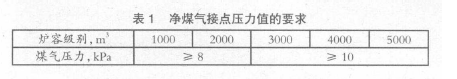 (10)確定熱風爐凈煤氣接點壓力時,應包括余熱回收裝置阻損在內(nèi)的系統(tǒng)流路阻力損失。凈煤氣接點壓力值應符合表1 的規(guī)定。