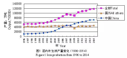 高爐工藝。在過去的10余年里,在我國生鐵產(chǎn)量高速增長的帶動下,世界生鐵的總量持續(xù)增加,2014年全球高爐煉鐵的產(chǎn)量為11.795 億噸,見圖1。國外生鐵總產(chǎn)量基本維持不變,2014年為4.679億噸,占39.67%;我國為7.116億噸,占60.33%。