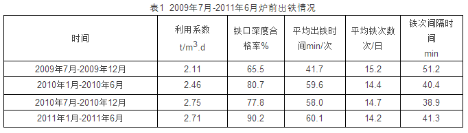爐前機物料消耗明顯降低。泥套澆注使用壽命由7天/個提高到30天/個,炮帽更換個數(shù)由300個/月降至25個/月,鉆桿更換根數(shù)由353.9根/月降至280根/月逐步扭轉(zhuǎn)了爐前生產(chǎn)的被動局面。目前,為適應(yīng)高爐高產(chǎn)穩(wěn)產(chǎn)的需要逐步由單鐵口出鐵作業(yè)過渡到雙鐵口出鐵作業(yè),縮短了出鐵間隔時間,使爐內(nèi)不至因爐前出鐵不及時而減風。為爐內(nèi)強化冶煉操作提供了前提條件。2009年6月-2011年6月爐前出鐵情況見表1。