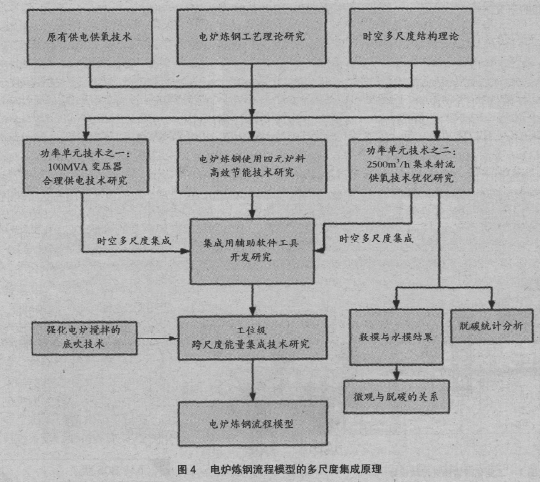 近年來,北京科技大學(xué)采用時空多尺度結(jié)構(gòu)理論對電爐煉鋼過程進(jìn)行研究,指出其物質(zhì)轉(zhuǎn)化過程中存在著微觀尺度、介觀尺度、單元操作尺度和工位尺度等多個時空尺度的結(jié)構(gòu)(如圖4)。在充分吸收國內(nèi)外鋼鐵企業(yè)現(xiàn)有過程控制模型的基礎(chǔ)上,結(jié)合電爐成本控制模型與電爐煉鋼流程專家指導(dǎo)模型,構(gòu)建了一套包括電爐、精煉與連鑄,實(shí)現(xiàn)成本監(jiān)控、過程優(yōu)化指導(dǎo)于一體的在線電爐煉鋼流程模型的多尺度模型。多尺度集成模型匯集了電爐煉鋼成本控制模型與電爐煉鋼流程的相關(guān)專家指導(dǎo)模型(包括鋼水成分與溫度預(yù)報(bào)、電爐終點(diǎn)預(yù)報(bào)與精煉過程合金優(yōu)化等功能)。開發(fā)的在線電爐煉鋼流程多尺度模型已成功應(yīng)用于新余新良特鋼、衡陽鋼管、馬來西亞安裕鋼鐵、臺灣易昇鋼鐵、西寧特鋼、天津鋼管等企業(yè)的電爐生產(chǎn)過程。平均噸鋼氧氣消耗降低2Nm3,電耗降低2kWh,金屬料消耗下降10kg,噸鋼成本降低30 元以上,經(jīng)濟(jì)及社會效益顯著。