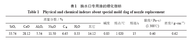 本試驗(yàn)在杭鋼轉(zhuǎn)爐煉鋼廠1、2 號(hào)機(jī)進(jìn)行,中間包是容量分別為14 和21 t 的矩形包,試驗(yàn)的鋼種為Q215、Q195、40Cr 和45 號(hào)鋼等低中碳鋼種。計(jì)劃換水口前3~10 min 內(nèi)停止使用原保護(hù)渣并開始向結(jié)晶器內(nèi)均勻加入換水口專用保護(hù)渣。換水口專用保護(hù)渣燒至見紅(允許有少量粉渣存在)時(shí),迅速更換水口。換水口后向結(jié)晶器內(nèi)加入普通保護(hù)渣,并密切關(guān)注結(jié)晶器內(nèi)的渣條狀況,及時(shí)進(jìn)行撈渣條作業(yè)。試驗(yàn)用換水口專用渣的理化指標(biāo)如表1 所示。