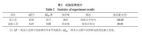 試驗(yàn)在1 號(hào)機(jī)160 mm×160 mm斷面和2 號(hào)機(jī)160 mm×200 mm斷面上進(jìn)行,共進(jìn)行了52 流次的換水口專用保護(hù)渣試驗(yàn),試驗(yàn)情況看換水口過程中結(jié)晶器冷卻水平均溫差比原工藝小0.29 ℃,拉矯機(jī)電流變化最大差值比原工藝小0.09 A,未出現(xiàn)拉漏和水口結(jié)冷鋼的情況,換水口段鑄坯表面顏色較亮且均勻,鑄坯表面質(zhì)量檢查情況看使用換水口渣的鑄坯表面出現(xiàn)結(jié)疤的整體程度較輕,換水口造成的廢坯減少100.2 t/月,這表明選型試驗(yàn)的保護(hù)渣具有較合理的黏度和熔化特性,能夠保證液渣均勻流入結(jié)晶器和鑄坯之間,并有足夠的渣膜,能均勻冷卻鑄坯和保證潤(rùn)滑,避免鑄坯粘結(jié),減輕結(jié)疤,試驗(yàn)具體情況如表2所示。