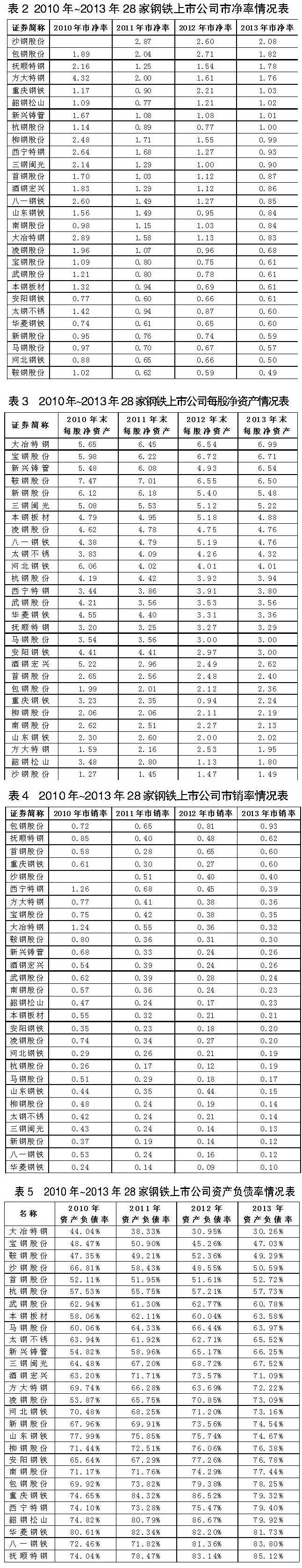 從2010年~2013年28家鋼鐵上市公司市凈率情況表(見(jiàn)表2)中可以看出,多數(shù)鋼鐵上市公司市凈率呈現(xiàn)逐年下降態(tài)勢(shì),有23家鋼鐵上市公司2010年市凈率是這4年中的最高值,有22家鋼鐵上市公司2013年市凈率是這4年中的最低值。