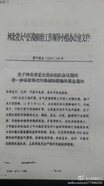 2014年11月7日,河北省亞太經(jīng)合組織會議空氣質(zhì)量工作指揮部(河北省大氣污染防治工作領(lǐng)導(dǎo)小組)下發(fā)《關(guān)于河北省亞太經(jīng)合組織會議期間進一步采取強化污染減排措施的緊急通知》,通知提到,經(jīng)河北省政府同意,各設(shè)區(qū)市,定州、辛集市在接到本通知后,立即采取更加嚴格的污染減排措施: