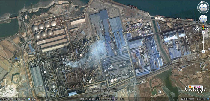 上圖是唐津廠區(qū)24Km2廠區(qū)鳥瞰圖,拍攝于2013年底,圖中亦可清楚看出7個球形料倉,冒煙處應該是燒結生產(chǎn)區(qū)域,我們在現(xiàn)場沒有看到冒煙景象。