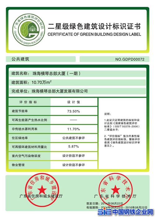 中國(guó)鋼鐵企業(yè)網(wǎng)二十冶訊11月21日,中國(guó)二十冶集團(tuán)橫琴總部大廈項(xiàng)目部收到廣東省住房和城鄉(xiāng)建設(shè)廳、廣東省科學(xué)技術(shù)廳頒發(fā)的《二星級(jí)綠色建筑設(shè)計(jì)標(biāo)識(shí)證書》。