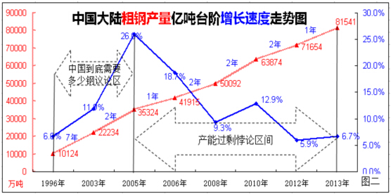 根據(jù)國統(tǒng)局修正數(shù)據(jù),2013年全國粗鋼產(chǎn)量由原來公告的7.79億噸,調(diào)整到8.15億噸。這說明,中國大陸的粗鋼產(chǎn)量在2013年就登上了8億噸臺階,而且從7億到8億的臺階只化了1年時間。由此認(rèn)為,這一組巨量數(shù)據(jù)至少表明三個方面的情況:一是從2003年起,我國粗鋼產(chǎn)量每一兩年登個億噸臺階,不僅相當(dāng)輕松,而且十分穩(wěn)??;二是不管行業(yè)產(chǎn)能過剩的爭論如何,粗鋼產(chǎn)量十多年來始終近似45度的斜率增長,這個巨量數(shù)據(jù)既是中國鋼鐵工業(yè)發(fā)展的必然,更是中國經(jīng)濟(jì)社會發(fā)展的必須。充分反映,十多年來,鋼鐵巨量的快速增長不僅僅是經(jīng)濟(jì)社會發(fā)展的要求,更是經(jīng)濟(jì)、社會發(fā)展的切實需要。當(dāng)然,也是“中國到底需要多少鋼”和“鋼鐵產(chǎn)能嚴(yán)重過剩”的有力回答。(見圖二)