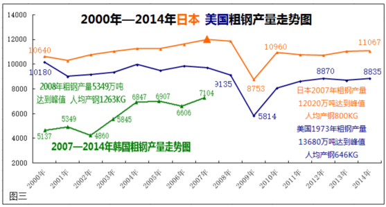進(jìn)入經(jīng)濟(jì)新常態(tài)以來,業(yè)內(nèi)對中國“鋼鐵峰值”(peaksteel)的觀點逐漸趨同。而去年以來鐵礦石、鋼材、焦煤價格的大幅下跌,似乎更堅定了中國鋼鐵已在峰值區(qū)域運(yùn)行看法?;蛟S,這乍看起來是鋼鐵行業(yè)的重大利空。但客觀分析,這未必不是件好事,其理由主要有兩個方面:一是達(dá)到階段性峰值后的鋼鐵需求仍然可以看好。以美、日、韓三國為例,粗鋼產(chǎn)量達(dá)到峰值后的幾十年來,仍然保持與經(jīng)濟(jì)社會發(fā)展的當(dāng)量需求,多數(shù)時段需求還顯強(qiáng)勁。更值得關(guān)注的是,由于各國的國情不同,峰值水平的人均產(chǎn)鋼量也有很大差異。特別是韓國,在人均產(chǎn)鋼達(dá)到1263公斤后,仍在不斷改寫峰值記錄,遠(yuǎn)較646公斤/人的美國和800公斤/人的日本高出許多。因此,僅用世界平均用鋼水平,或發(fā)達(dá)國家完成工業(yè)化進(jìn)程時的人均產(chǎn)鋼水平衡量是否到達(dá)峰值,一定是很欠缺的。因為,國情不一,峰值水平也定不一樣。誠然,用經(jīng)濟(jì)衰退期出現(xiàn)的增速降低和價格低迷來判定峰值,也定片面(見下圖三)。雄辯說明,鋼鐵需求始終與經(jīng)濟(jì)社會的發(fā)展相適應(yīng),任何數(shù)據(jù)極值都具有局限性、相對性和階段性??梢哉J(rèn)為,經(jīng)濟(jì)社會對鋼鐵的當(dāng)量需求不僅是必須的、長期的,而且一定是應(yīng)勢演繹的。所以,繼續(xù)看好世界經(jīng)濟(jì)發(fā)展對鋼鐵永久需求;二是經(jīng)濟(jì)社會發(fā)展對鋼鐵的需求不可限量。雖然我國經(jīng)濟(jì)總量居世界第二,但人均水平卻遠(yuǎn)排在全球80名之后,根據(jù)世界銀行的標(biāo)準(zhǔn),約有2億多人口生活在貧困線以下,這差不多相當(dāng)于法國、德國、英國人口的總和。雖然我國鋼鐵、水泥等大宗物資產(chǎn)量世界第一,但與工業(yè)化進(jìn)程、城鎮(zhèn)化建設(shè)、現(xiàn)代化水平、高品質(zhì)生活等還極不匹配。所以,繼續(xù)看好中國經(jīng)濟(jì)社會發(fā)展對鋼鐵長期的歷史需求(參見20140529薛和平《對鋼鐵時艱的分析與思考》)。