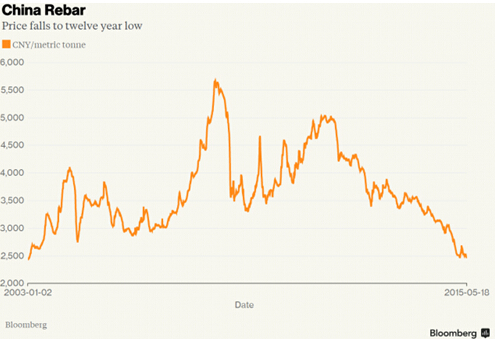 螺紋鋼現(xiàn)貨價格2015年至今下跌11%,延續(xù)了過去4年的持續(xù)走低態(tài)勢。盡管季節(jié)性因素(4-6月的需求高峰)之前螺紋鋼一度出現(xiàn)反彈,但是房地產(chǎn)需求下滑還是導致鋼材價格下跌。周一中國國家統(tǒng)計局的最新數(shù)據(jù)顯示,4月中國70個大中城市中同比價格上漲的城市僅有1個,下跌有69個(上月70個全部下跌)。