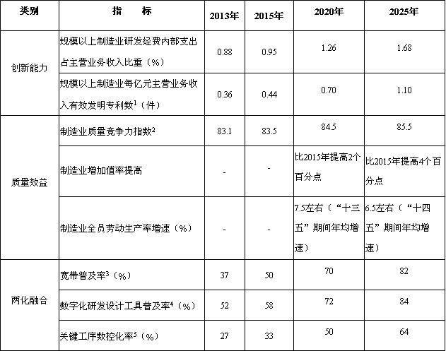 到2025年,制造業(yè)整體素質(zhì)大幅提升,創(chuàng)新能力顯著增強(qiáng),全員勞動(dòng)生產(chǎn)率明顯提高,兩化(工業(yè)化和信息化)融合邁上新臺(tái)階。重點(diǎn)行業(yè)單位工業(yè)增加值能耗、物耗及污染物排放達(dá)到世界先進(jìn)水平。形成一批具有較強(qiáng)國(guó)際競(jìng)爭(zhēng)力的跨國(guó)公司和產(chǎn)業(yè)集群,在全球產(chǎn)業(yè)分工和價(jià)值鏈中的地位明顯提升。