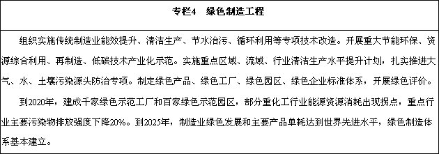 加大先進(jìn)節(jié)能環(huán)保技術(shù)、工藝和裝備的研發(fā)力度,加快制造業(yè)綠色改造升級(jí);積極推行低碳化、循環(huán)化和集約化,提高制造業(yè)資源利用效率;強(qiáng)化產(chǎn)品全生命周期綠色管理,努力構(gòu)建高效、清潔、低碳、循環(huán)的綠色制造體系。