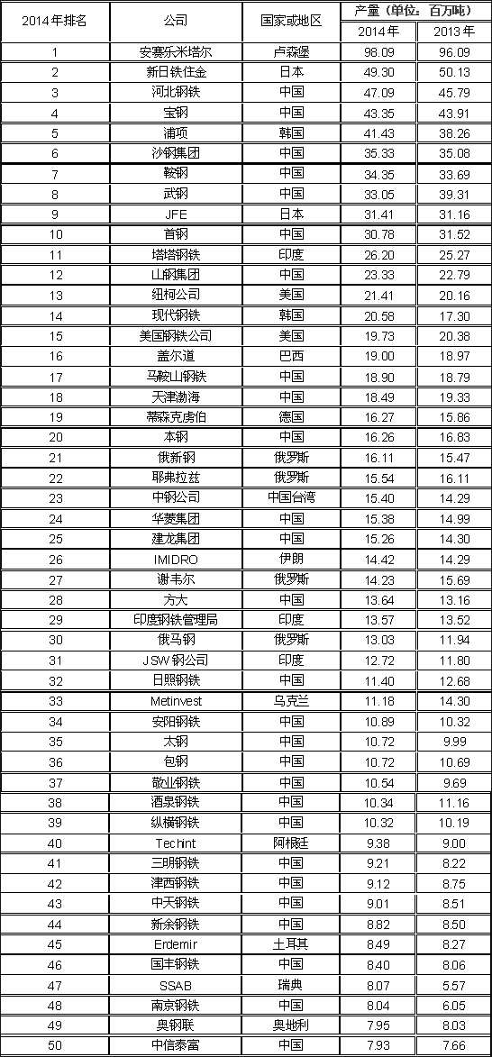 2014年世界主要鋼廠粗鋼產(chǎn)量及排名(前50名)