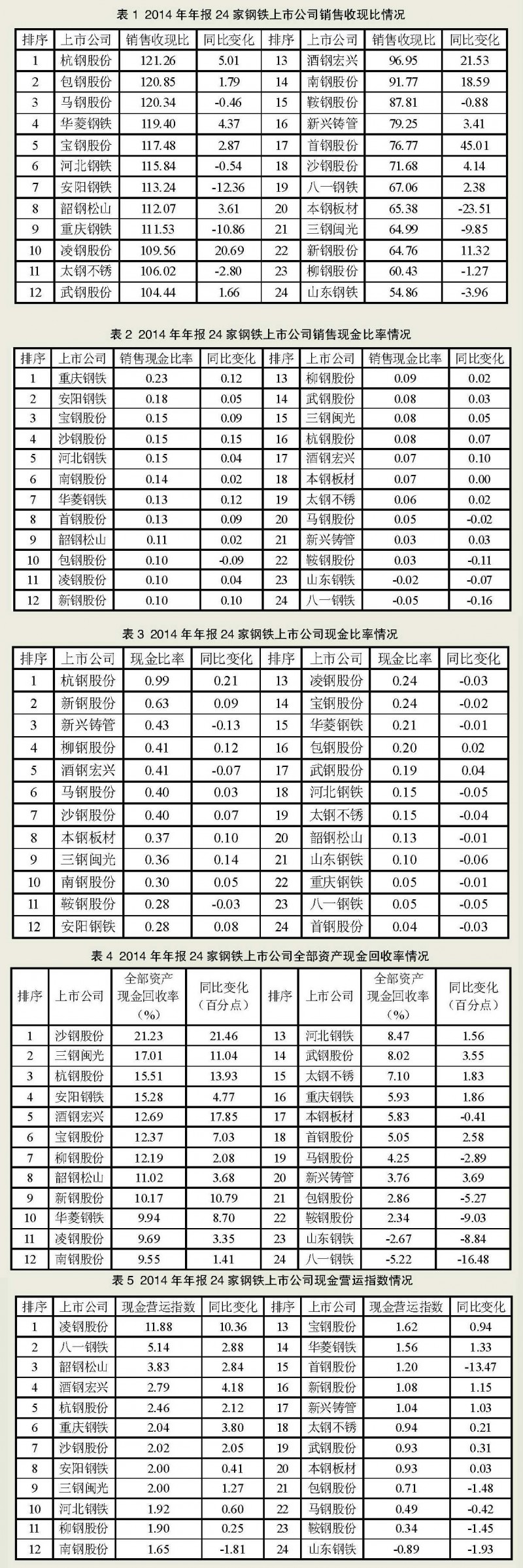 通過對2014年24家鋼鐵上市公司年報分析可以看出,在銷售收現比方面,SW鋼鐵板塊(含普鋼、特鋼,下同)銷售收現比平均為98.60,24家鋼鐵上市公司中有12家上市公司超過平均水平(見表1)。山東鋼鐵的銷售收現比在24家上市公司中排名墊底,是行業(yè)平均水平的55.64%,是杭鋼股份的45.24%。從同比情況看,共有14家上市公司銷售收現比同比上升,表明2014年大多數上市公司在銷售商品回收現金的速度同比有所加快。