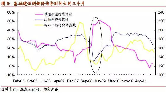 從09年1-2月份基礎(chǔ)建設(shè)投資提速,5月鋼材價(jià)格開始上漲,時(shí)滯大約3個(gè)月