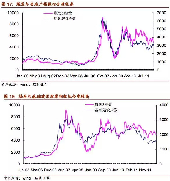 煤炭與最下游的兩大行業(yè)(基礎(chǔ)建設(shè)和房地產(chǎn))股票指數(shù)走勢基本一致。