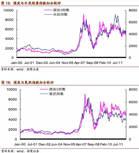 煤炭與直接下游四大行業(yè)(火電、鋼鐵、水泥、氮肥)股票指數(shù)走勢基本一致。從稍長時(shí)期看,火電指數(shù)的逆周期特性并未反應(yīng)出來。