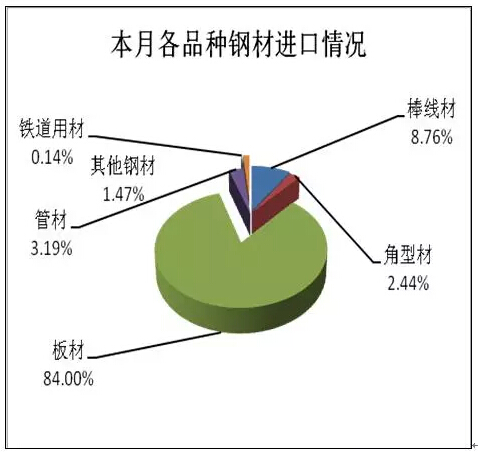 本月全部鋼材進(jìn)口中棒線材占8.76%,角型材占2.44%,板材占84%。