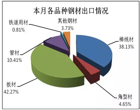 本月全部鋼材出口中棒線材占38.13%,角型材占4.65%,板材占42.27%。