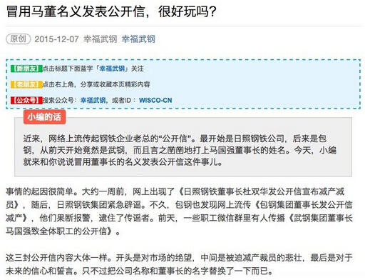 武鋼集團官方微信“幸福武鋼”發(fā)布辟謠文章《冒用馬董名義發(fā)表公開信,很好玩嗎?》