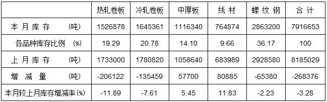 本月5大品種鋼材庫(kù)存環(huán)比各有升降,其中線材上升幅度最大。熱軋卷板庫(kù)存環(huán)比下降11.89%,冷軋卷板庫(kù)存環(huán)比下降7.61%,中厚板庫(kù)存環(huán)比上升5.45%,線材庫(kù)存環(huán)比上升11.83%,螺紋鋼庫(kù)存環(huán)比下降2.23%,詳見(jiàn)下表。