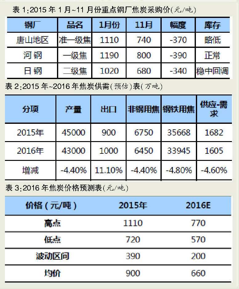 市場(chǎng)方面,2016年焦炭產(chǎn)能仍過(guò)剩,產(chǎn)量或繼續(xù)減少,需求同步減少,整體供需矛盾仍存,倒逼獨(dú)立焦化廠停產(chǎn)倒閉。正常生產(chǎn)的焦化企業(yè)為確保資金鏈周轉(zhuǎn)順暢,不得不降價(jià)銷售以回籠資金。上游煤價(jià)繼續(xù)回落,預(yù)計(jì)2016年焦炭?jī)r(jià)格上下震蕩幅度在200元/噸。