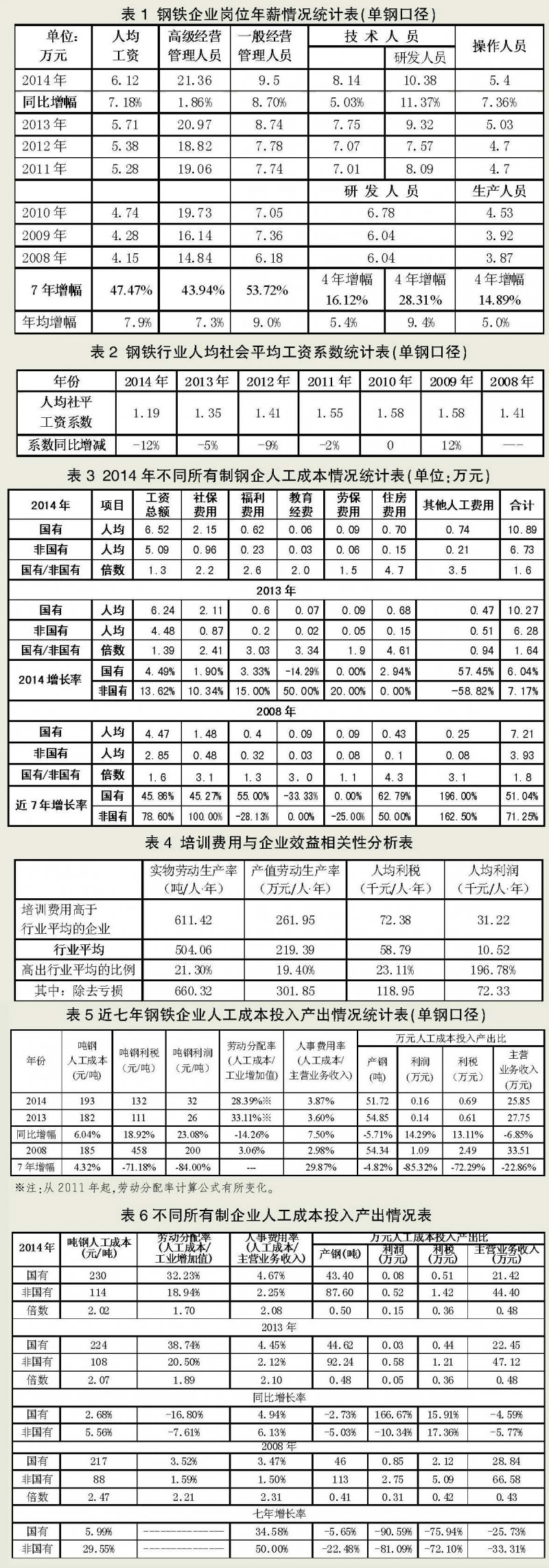 從表5可以看出,由于2014年行業(yè)主業(yè)在崗職工實(shí)物勞動(dòng)生產(chǎn)率比2013年增長(zhǎng)了1.61%,同時(shí),人均人工成本增長(zhǎng)了7.63%,相互抵消后,2014年噸鋼人工成本為193元/噸,比2013年增加了11元/噸,提高了6.04%。由于人工成本增幅超過(guò)勞動(dòng)生產(chǎn)率增幅,人事費(fèi)用率(人工成本/主營(yíng)業(yè)務(wù)收入)有所增長(zhǎng)。但是,由于工業(yè)增加值增幅超過(guò)人工成本增幅,即人工成本在工業(yè)增加值中所占的比例有所下降,勞動(dòng)分配率有所下降。