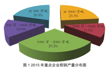 在重點(diǎn)統(tǒng)計(jì)企業(yè)中,2015年粗鋼產(chǎn)量超過3000萬噸的企業(yè)有四家,產(chǎn)量占重點(diǎn)企業(yè)比重為23.3%;產(chǎn)量2000萬-3000萬噸企業(yè)有三家,產(chǎn)量占比為11.9%;產(chǎn)量1000萬-2000萬噸企業(yè)有14家,產(chǎn)量占比為29.2%;產(chǎn)量500萬-1000萬噸企業(yè)有12家,產(chǎn)量占比為15.0%;剩余企業(yè)均為產(chǎn)量小于500萬噸企業(yè),產(chǎn)量占比為20.5%(見圖1)。