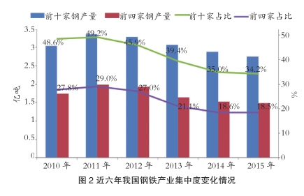 2015年我國鋼鐵產(chǎn)業(yè)集中度進(jìn)一步下滑,其中,粗鋼產(chǎn)量排名前四家的企業(yè)合計(jì)產(chǎn)量占全國比重為18.5%,較2014年下降0.1個(gè)百分點(diǎn);排名前十家企業(yè)合計(jì)產(chǎn)量占全國比重為34.2%,較2014年下降0.8個(gè)百分點(diǎn)(見圖2)。主要有以下兩點(diǎn)原因:一是前四家鋼廠減產(chǎn)幅度為2.74%;前十家鋼廠減產(chǎn)幅度為4.27%,均高于全國2.33%的減產(chǎn)幅度;二是重組后部分企業(yè)出現(xiàn)剝離,其中,寶鋼退出寧波鋼鐵,武鋼退出柳州鋼鐵,導(dǎo)致前四家和前十家鋼廠產(chǎn)量比重下降。