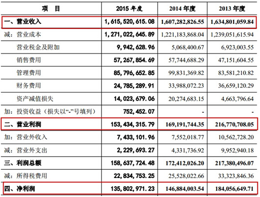 根據(jù)公司招股書(shū)顯示,2013-2015年,武進(jìn)不銹的營(yíng)業(yè)收入分別為16.35億元、16.07億元和16.16億元,連續(xù)三年原地踏步;營(yíng)業(yè)利潤(rùn)分別為2.16億元、1.69億元、1.53億元,凈利潤(rùn)分別為1.84億元、1.47億元和1.36億元,連年下滑。