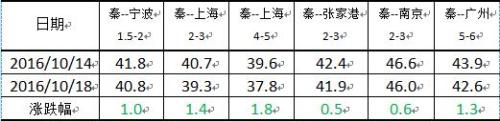 秦皇島煤炭網(wǎng)訊本報告期(2016/10/15-2016/10/18),沿海煤炭運輸市場運價結(jié)束此前的跳漲走勢,開始出現(xiàn)小幅下降至1000點以內(nèi),各航線運價均有不同程度的下跌。10月18日,海運煤炭運價指數(shù)OCFI報收980.57點,期環(huán)比下行2.50%。分子指數(shù)來看,華東線指數(shù)報收1032.00點,期環(huán)比下行2.39%;華南線指數(shù)報收808.39點,期環(huán)比下行2.96%。