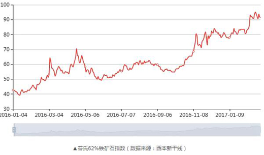 進入2017年以后,該指數(shù)的上漲步伐并未停止,并在2月21日達到95.05美元/噸,這也是普氏62%鐵礦石指數(shù)30個月的新高。