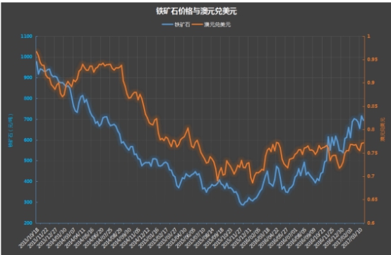 作為大宗商品出口國,澳大利亞對大宗商品的漲勢喜聞樂見,鐵礦石市場回暖對澳洲經(jīng)濟(jì)形成了有效的支撐。近年來澳元與鐵礦石價格保持同步下行趨勢,但這一局面在2016年初的時候得到改變,澳元和鐵礦石開始扭轉(zhuǎn),并且在2016年底的時候鐵礦石漲幅超過了澳元。