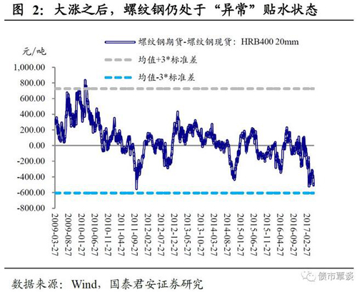 需要注意的是,即使經(jīng)過(guò)近期的“報(bào)復(fù)性上漲”,螺紋鋼期貨對(duì)現(xiàn)貨的貼水幅度仍達(dá)到近450元/噸,這幾乎是歷史上的最低水平,已經(jīng)非常接近理論上的“極值區(qū)間(均值減3個(gè)標(biāo)準(zhǔn)差)”。異常“深度貼水”意味著,目前市場(chǎng)對(duì)未來(lái)鋼價(jià)走勢(shì)已經(jīng)幾乎不能更加悲觀。