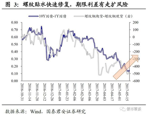 短期看,螺紋鋼期貨已經(jīng)開(kāi)始修復(fù)貼水,相應(yīng)地,如果參照歷史數(shù)據(jù)的相關(guān)關(guān)系,國(guó)債期限利差也面臨重新走擴(kuò)的風(fēng)險(xiǎn)??紤]到短端收益率受制于資金成本和同業(yè)存單的約束,一定程度上存在“剛性”,期限利差走擴(kuò)更大概率會(huì)通過(guò)長(zhǎng)端上行來(lái)實(shí)現(xiàn)。從昨日市場(chǎng)波動(dòng)看,商品期貨與國(guó)債期貨已經(jīng)走出了同漲同跌的“怪圈”,螺紋鋼價(jià)格進(jìn)一步上行可能對(duì)應(yīng)債市的下跌壓力加劇。