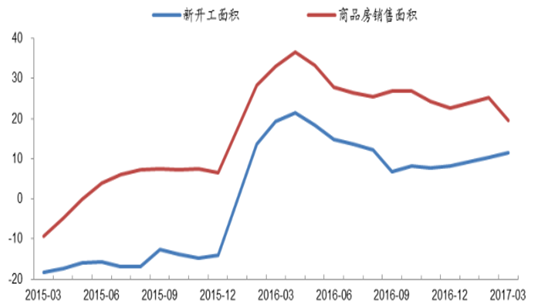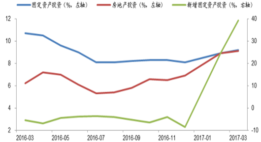 一季度基建投資增加,1-3 月新增固定資產(chǎn)投資完成額 4.2 萬億元,同比+39.2%,較 16 年有大幅提升;房地產(chǎn)投資完成額 19291 億元,同比+9.1%。